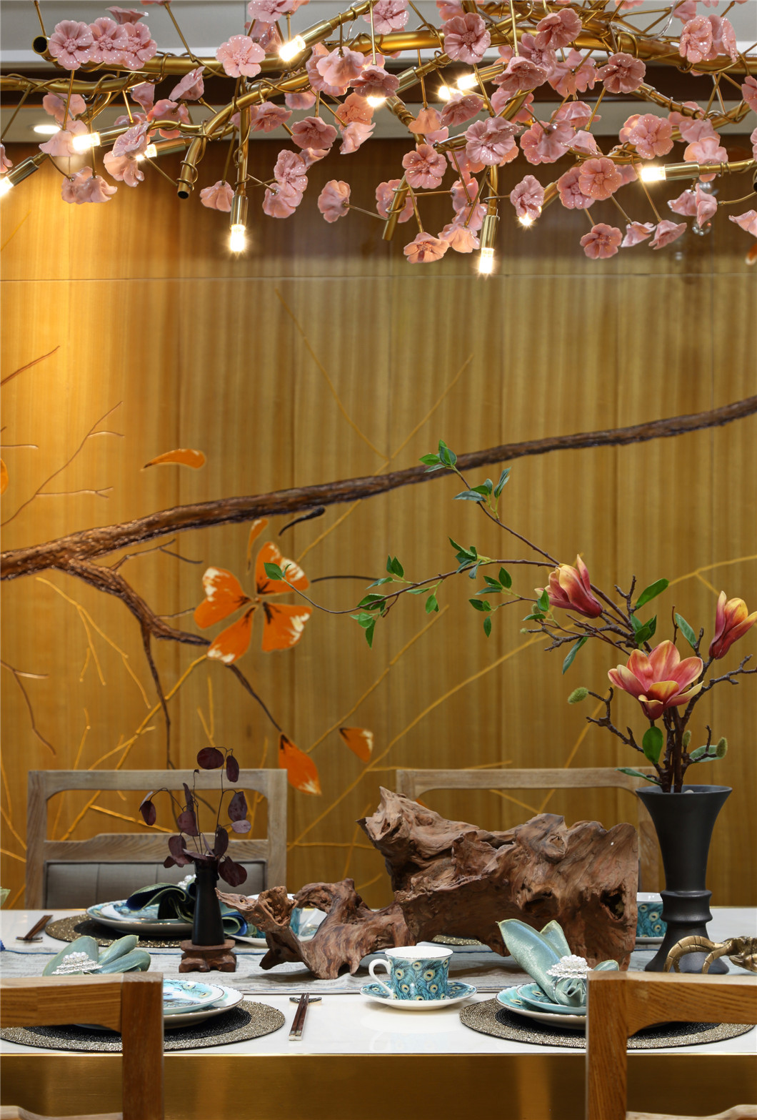 餐厅以温馨和暖的黄色为基调,无论是灯光,还是木质护墙板都让人倍感亲切,墙面与灯饰利用鸟雀花卉等图案装饰,来表达书香与自然的概念。舒适朗阔的空间,透着一股幽幽的花香,墙上的小鸟好似在林间欢快翱翔。中国注重餐饮文化,餐厅成为家居生活的重心,不仅要美观,更要注重其功能的实用性。餐厅地毯沿用梅花纹路造型,与背景墙面相呼应,搭配原木色形态优美的桌椅,衬上一盏中式花卉艺术吊灯,于现代风尚中流露几分温婉秀雅的东方情韵,让一家人在温馨惬意中,交流感情,共享美食。