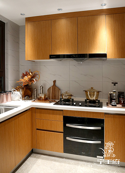 橱柜,选用倾向于高雅调性的驼色,柜体上优美的原木纹路,简约时尚且富有轻奢气息。